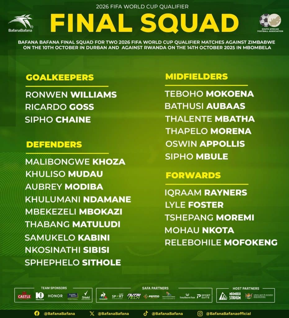South Africa head coach Hugo Broos has released his final squad for the concluding fixtures in the 2026 FIFA World Cup qualifiers.